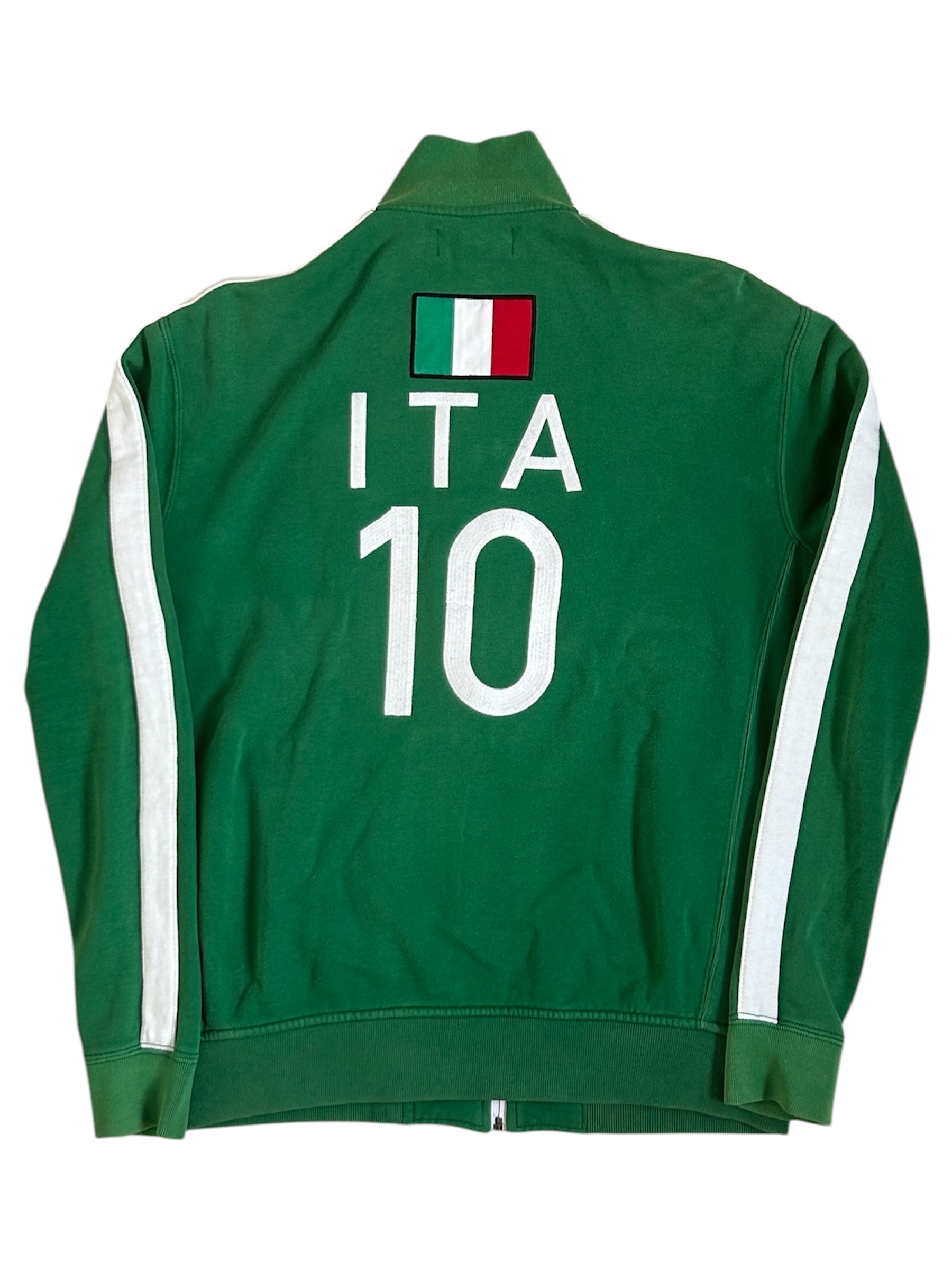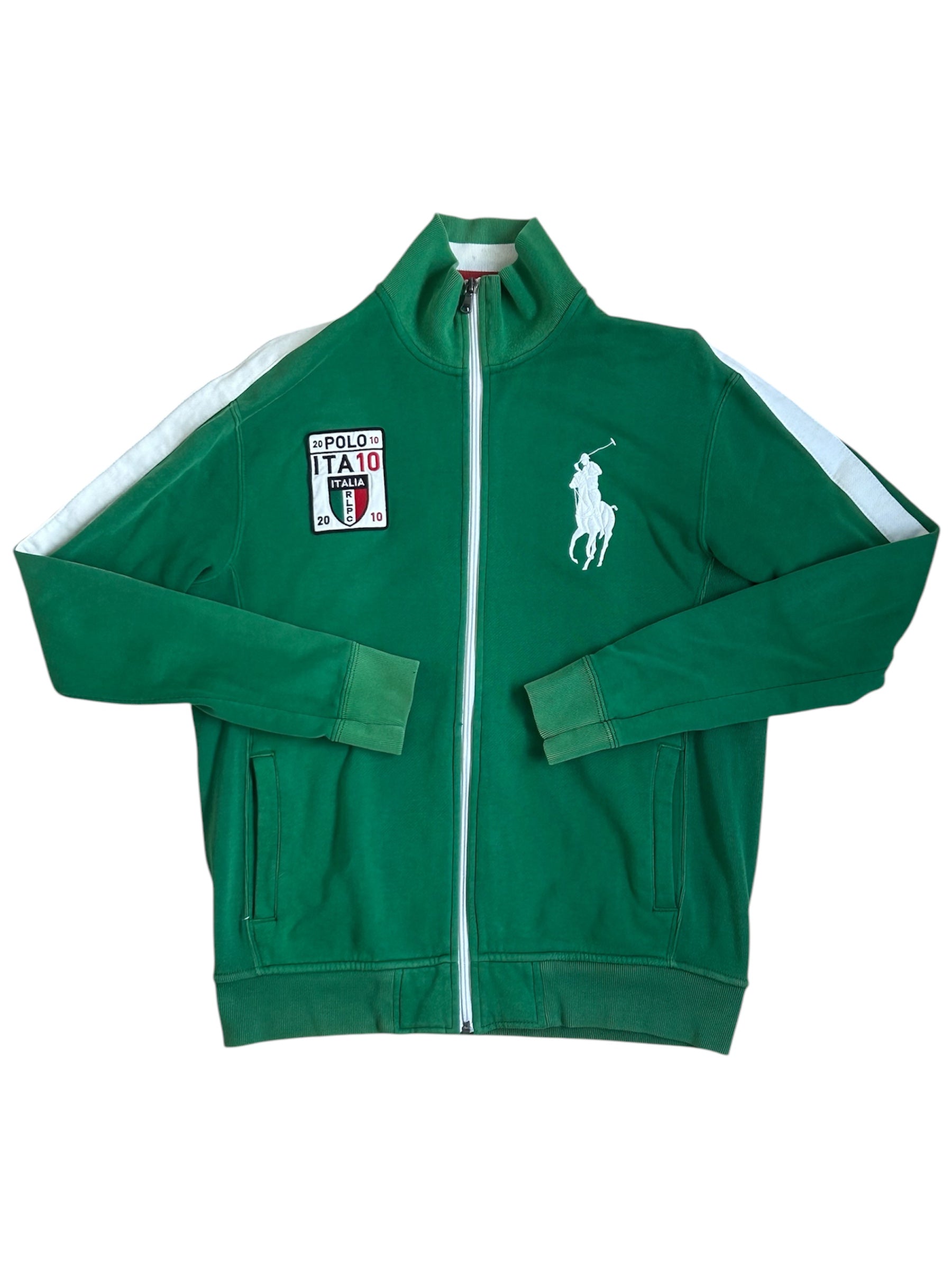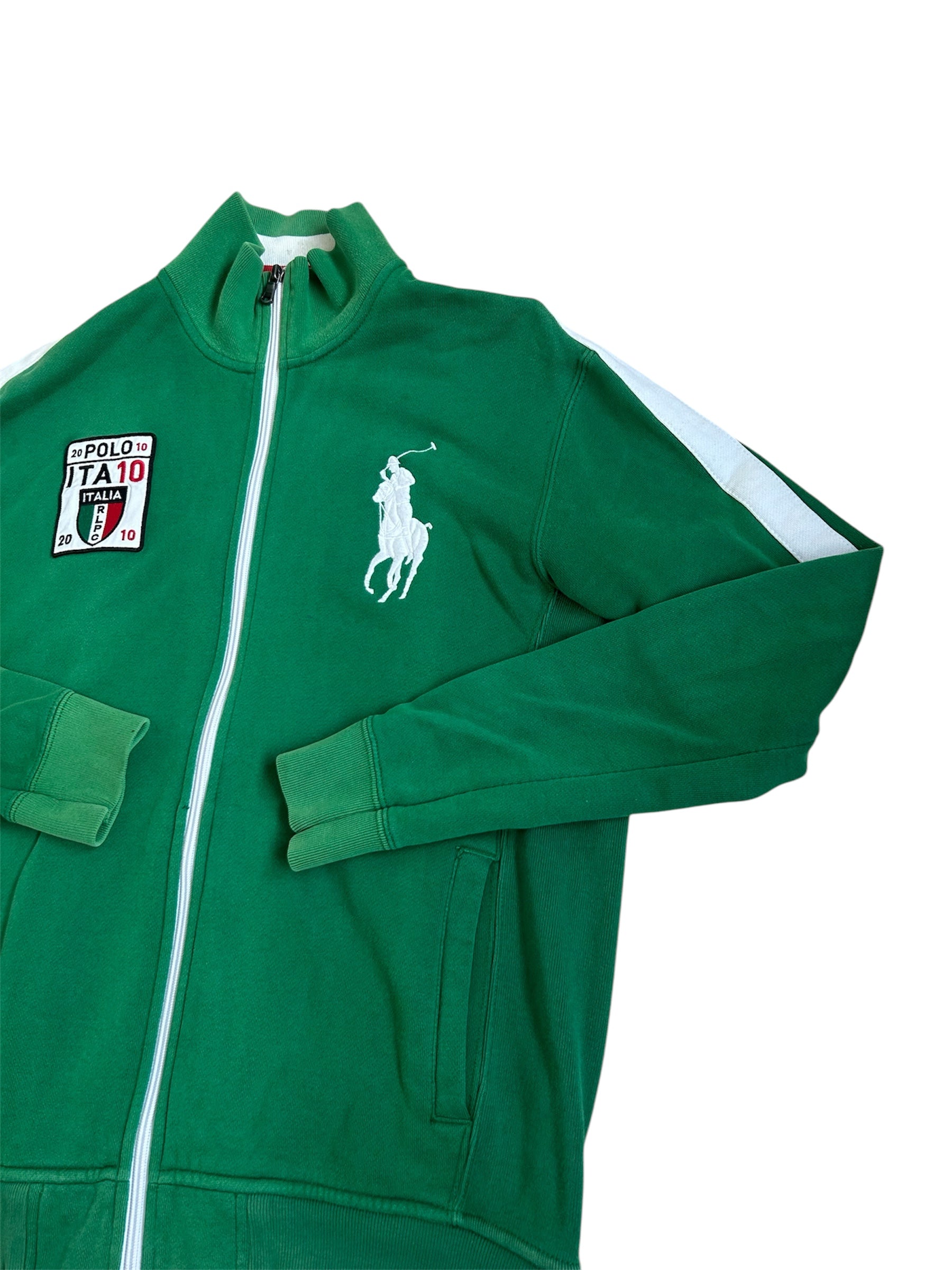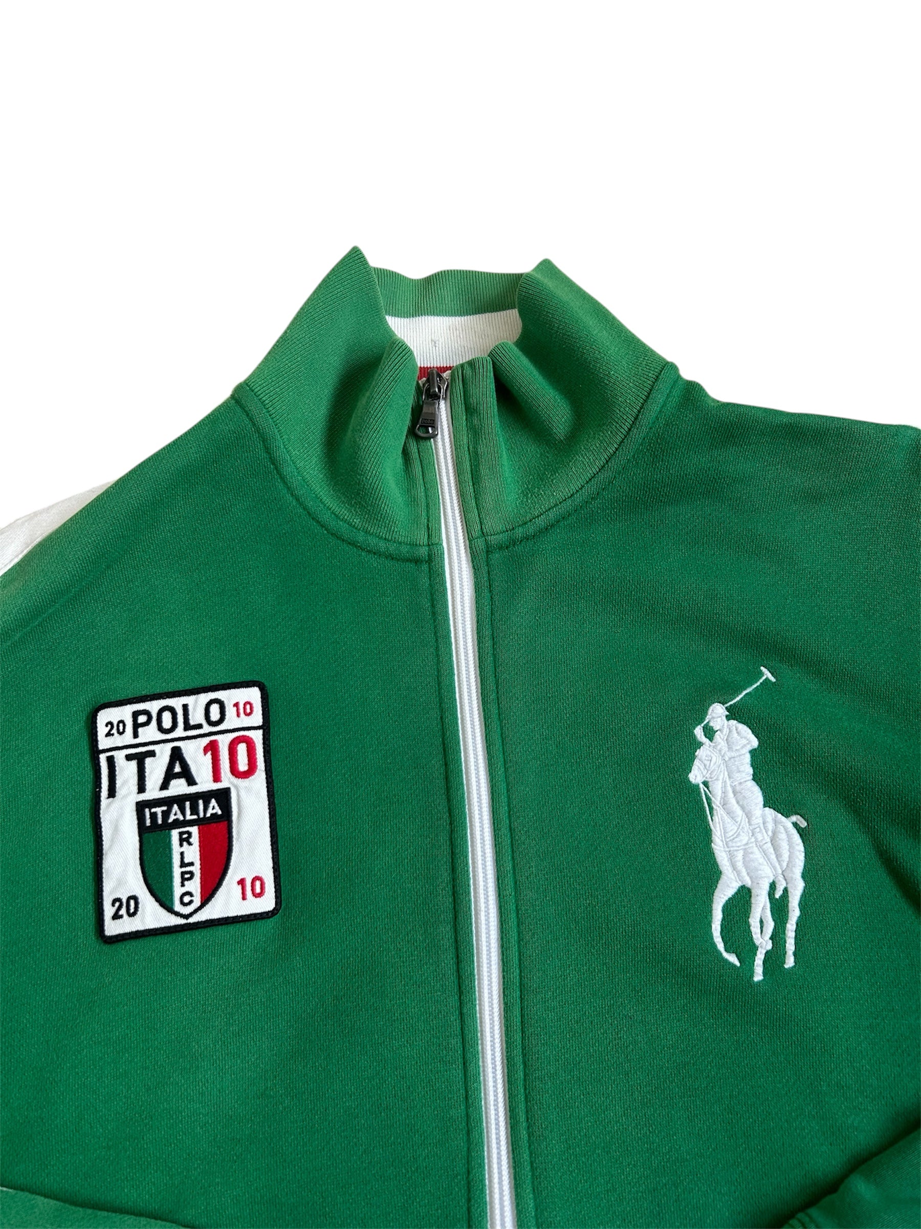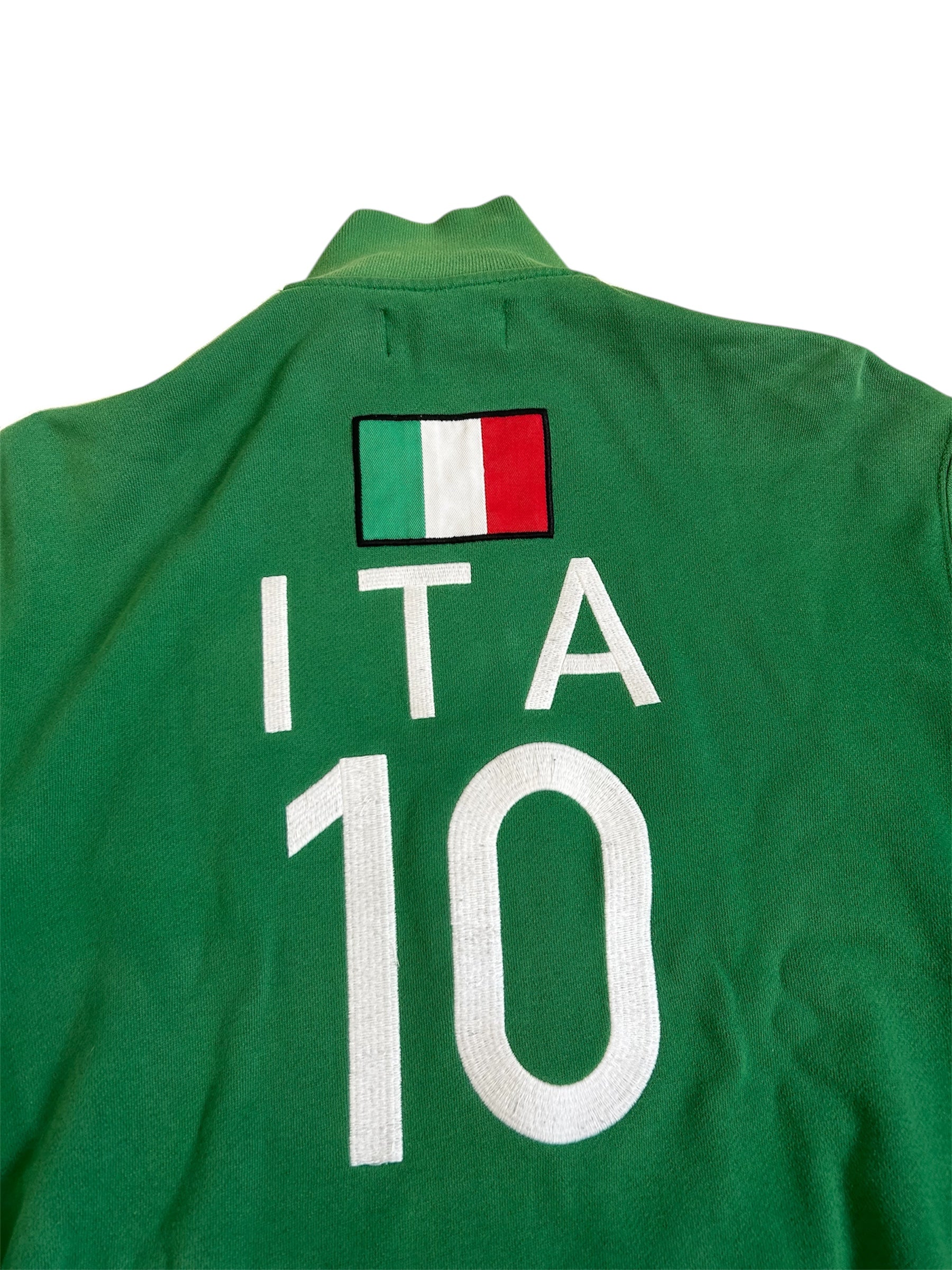Fabricada 100 % en algodón de alta calidad , presenta el logotipo de Big Pony , el escudo de la selección italiana bordado y un diseño de cremallera completa con detalles deportivos de rayas blancas en las mangas . El color verde representa los colores nacionales italianos , lo que le confiere un atractivo auténtico y coleccionable . Ya no se fabrica , lo que la convierte en una prenda excepcional y codiciada por los amantes de Ralph Lauren.