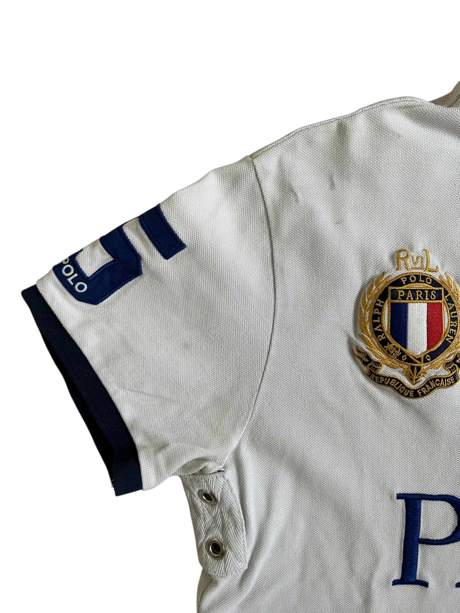 Made from 100% high-quality cotton, it features the Big Pony logo, bold "PARIS" lettering, an embroidered France crest, and the number 5 on both sleeves—a signature detail in Ralph Lauren’s polo designs. No longer in production, making it a rare and collectible item for Ralph Lauren enthusiasts.