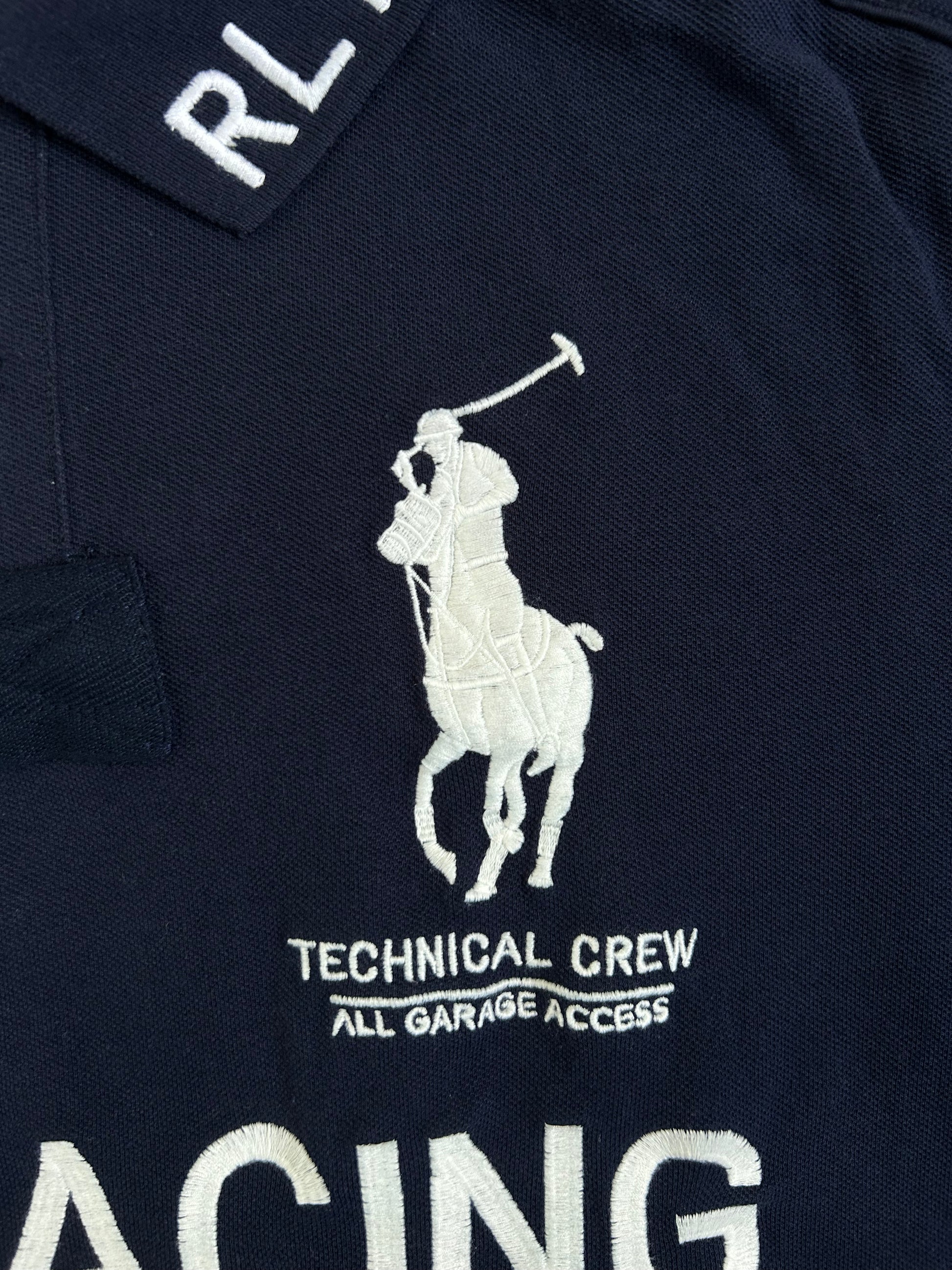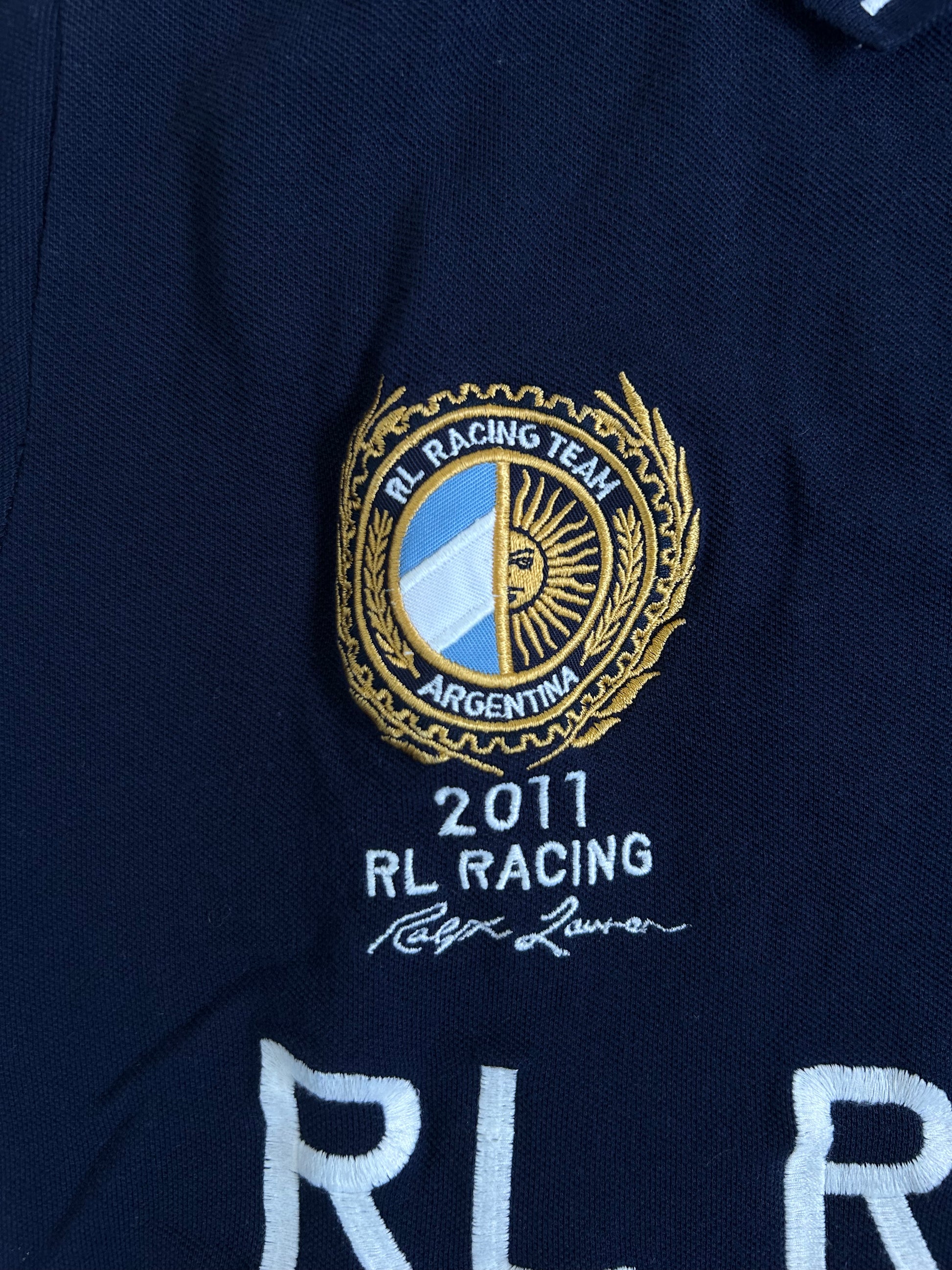 Made from 100% high-quality cotton, it features the Big Pony logo, bold "RL RACING" lettering, an embroidered Argentinian crest, and "RL Racing" on both sleeves. No longer in production, making it a rare and collectible item for Ralph Lauren enthusiasts.