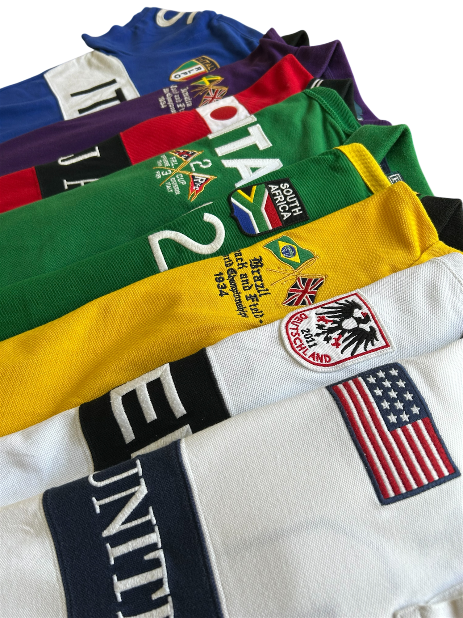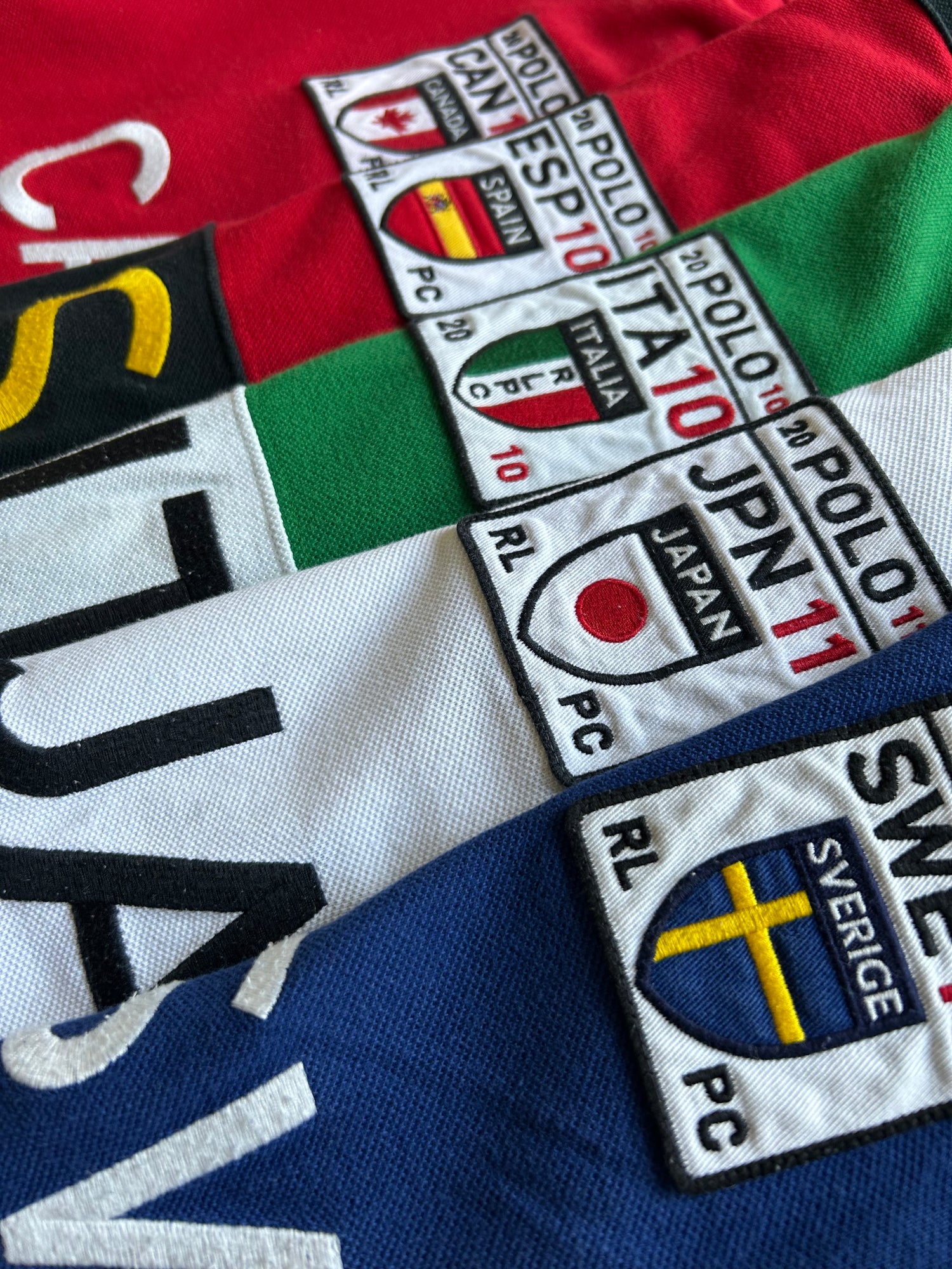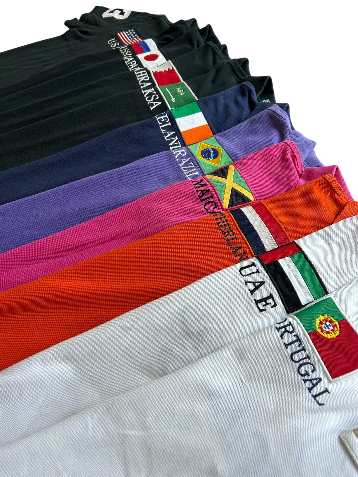 The Polo Ralph Lauren Big Pony Flag Polo collection features the country’s flag embroidered on the chest with a small spell-out below. The number 3 is printed on the right sleeve. The back may show a large number 3, the flag, and the country name, while others may display only the number or have a clean back. These variations make them iconic and highly collectible.