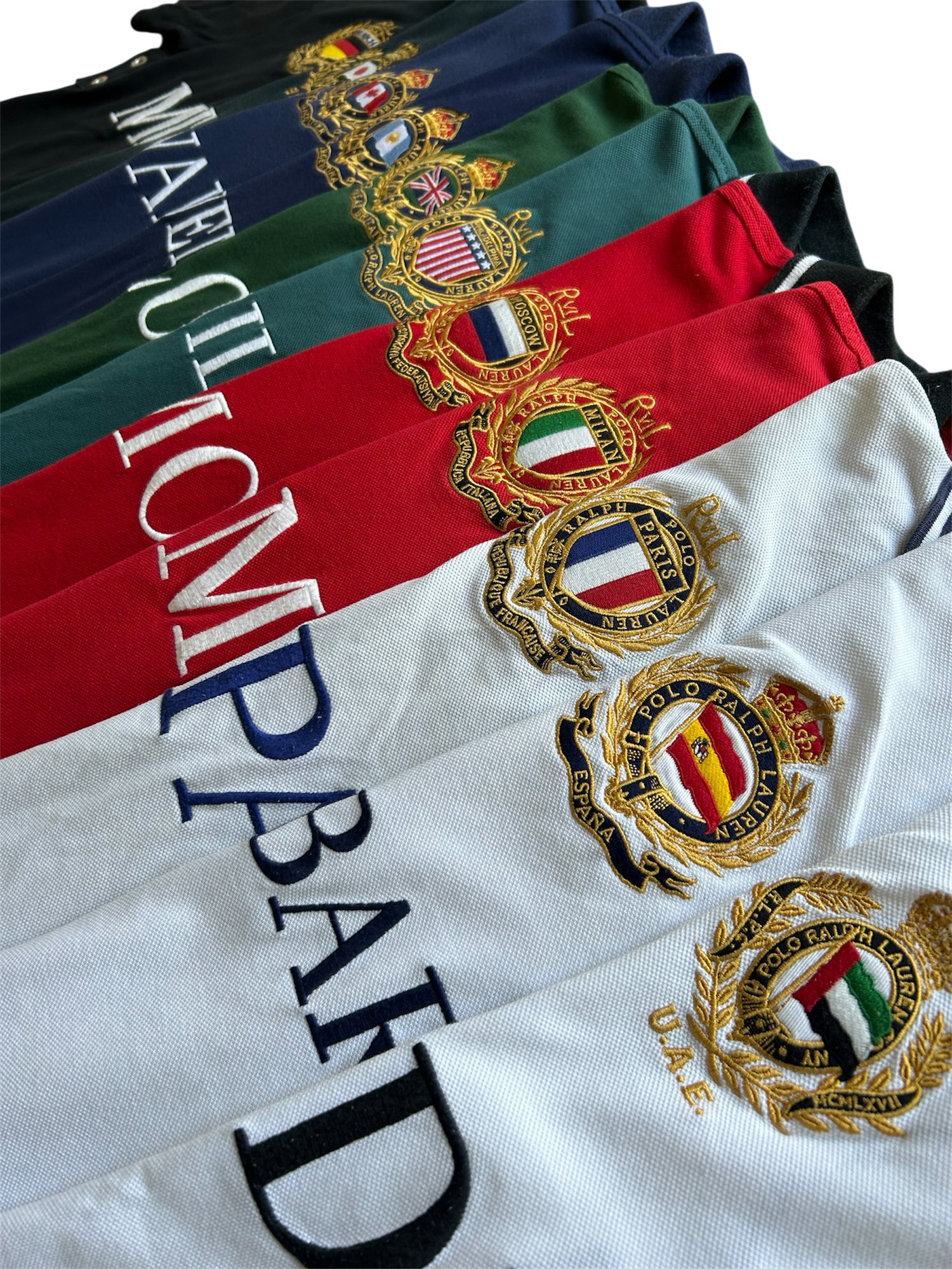The Polo Ralph Lauren Big Pony City Polo collection represents various cities. These polos are identifiable by the bold spell-out on the front and the city's national flag on the embroidery chest crest. They always feature the number 2, 3 or 5 on the sleeves, with the same number displayed on the back, making them iconic and highly collectible.