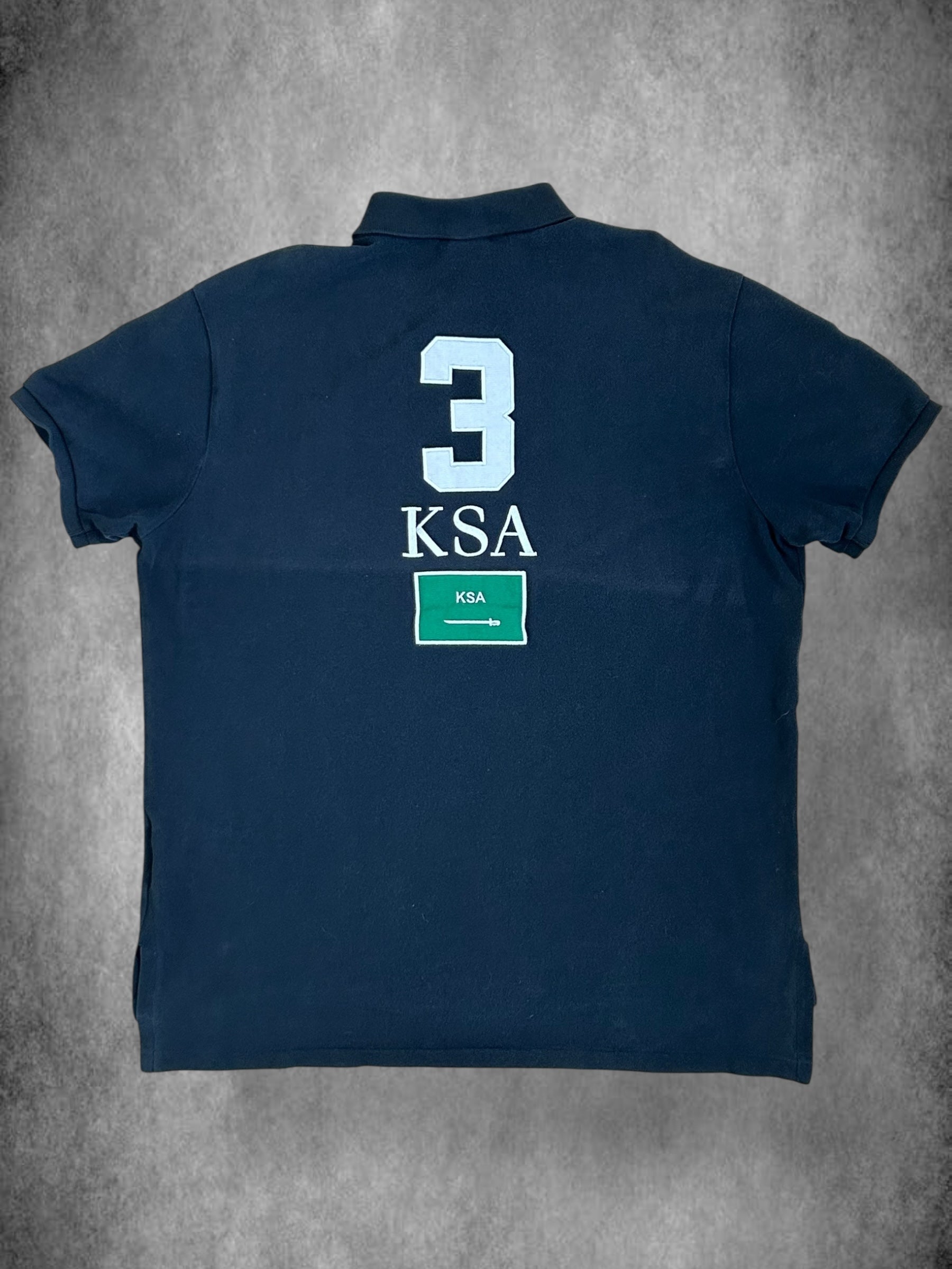 Made from 100% high-quality cotton, it features the Big Pony logo, bold "KSA" lettering with the national flag, and the number 3 on the sleeve—a signature detail in Ralph Lauren’s polo designs. No longer in production, making it a rare and collectible item for Ralph Lauren enthusiasts.