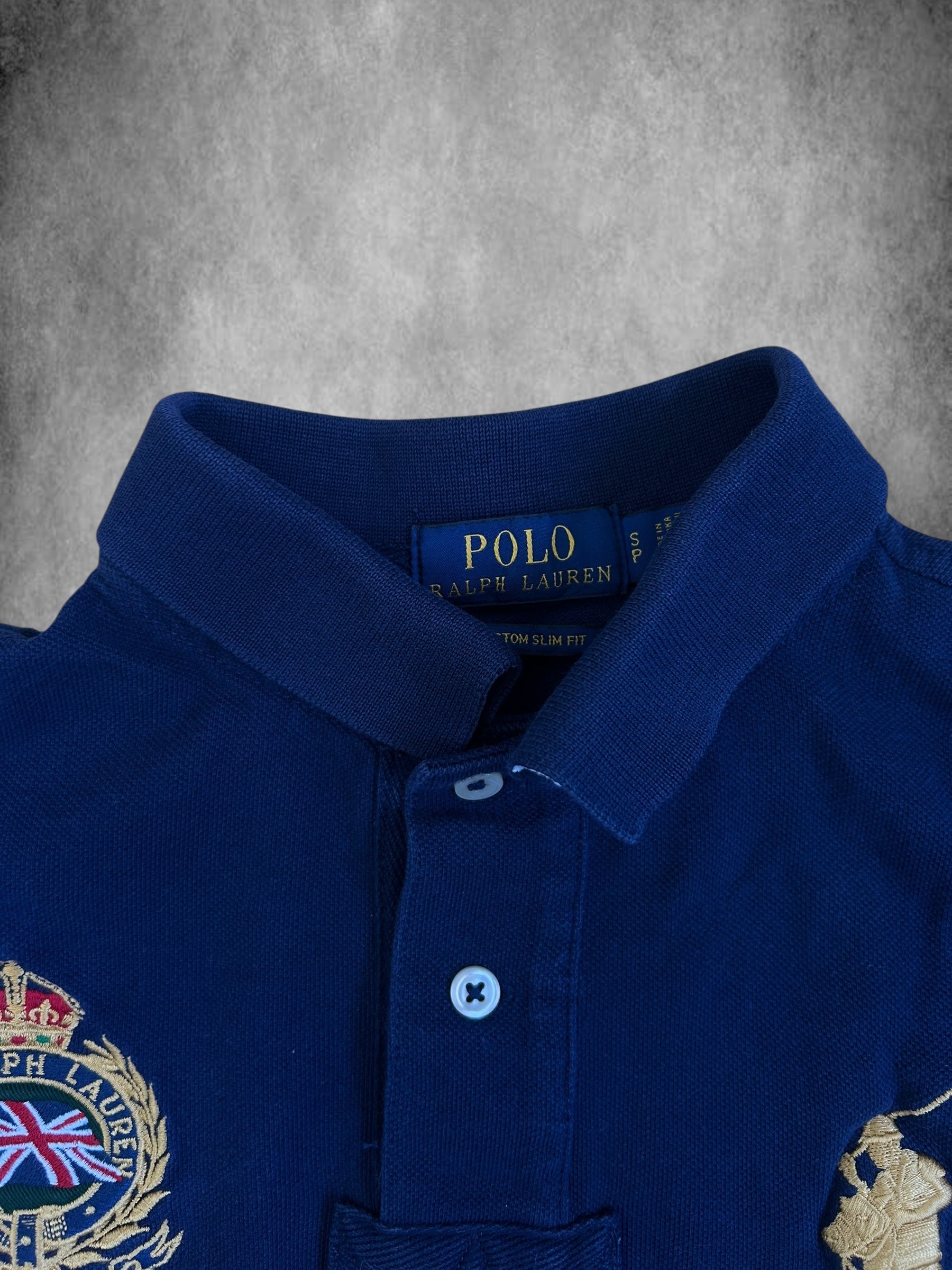 Made from 100% high-quality cotton, it features the Big Pony logo, bold "LONDON" lettering, an embroidered British team crest, and the number 2 on both sleeves—a signature detail in Ralph Lauren’s polo designs. No longer in production, making it a rare and collectible item for Ralph Lauren enthusiasts.