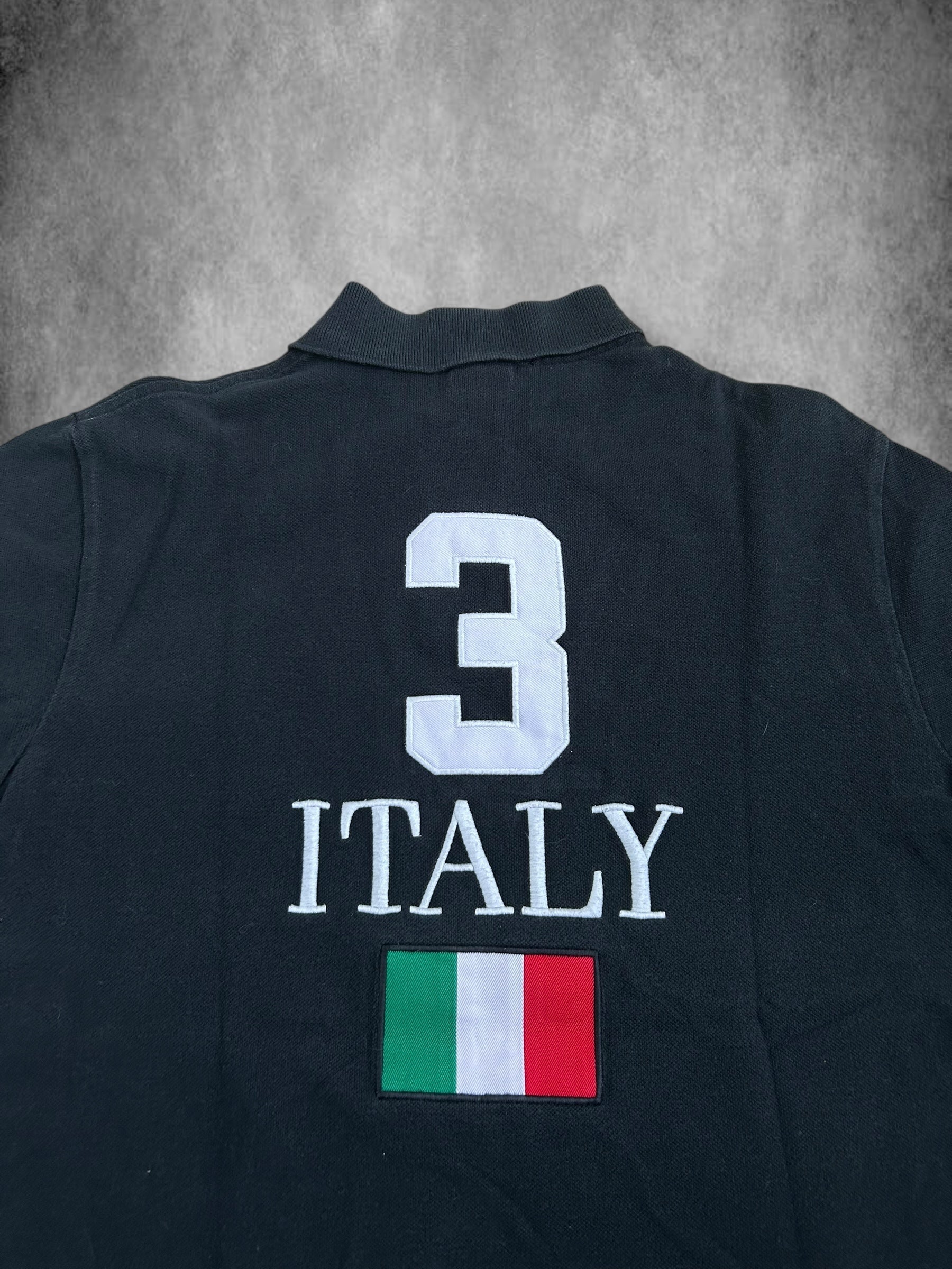 Made from 100% high-quality cotton, it features the Big Pony logo, bold "ITALY" lettering, an embroidered Italy team crest, and the number 3 on the sleeve—a signature detail in Ralph Lauren’s polo designs. No longer in production, making it a rare and collectible item for Ralph Lauren enthusiasts.